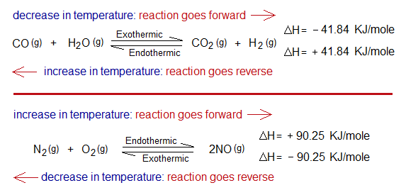 - Consider another system, the synthesis of NO gas (nitric oxide, nitrogen monoxide) by chemical reaction between N2 & O2 gases. It is endothermic in forward direction; while exothermic in reverse. So, the decrease in temperature will shift the reaction towards left side; and increase in temperature will shift the reaction in opposite side; having the same ∆H, but with opposite signs.