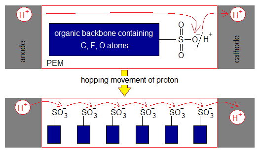 - Electrolyte: (1) The alkaline fuel cell (AFC) contains 30-40% aqueous KOH solution. It is good source of hydroxide ion (OH–). (2) Nafion membrane (developed in 1962) is a first solid synthetic ionic polymer, consisting of ionomers, that is used in proton-exchange membrane fuel cell (PEMFC). It carries H+ ions from anode to cathode. The sulphonate ions (SO3-) loses its acidic hydrogen and the proton from anode makes its loose bonding with its oxide ion. The sulphonates are fixed in membrane, but protons hop (jump) from one to another oxide ion and eventually enter into cathode.