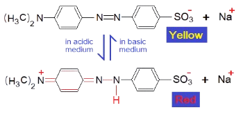 The red colour of the indicator in acidic medium changes at PH 4.4 and turns yellow in basic medium. The structural changes have been shown here. In acidic medium, one of the azo nitrogen atom attains acidic hydrogen and double bond between N, N shifts between azo-N & aromatic ring-C at one side. Resultantly, across that ring, another double bond is created between N of secondary amine and the C of the concerned ring; and as per need the aromaticity of the benzene ring rearranges its delocalized π- π overlapping. In acidic medium, the structure is a zwitter ion, as shown below.
