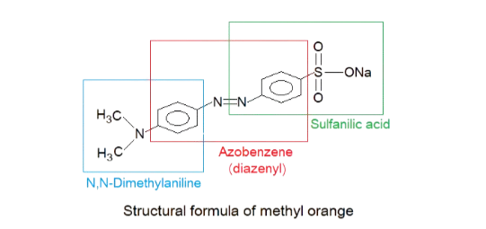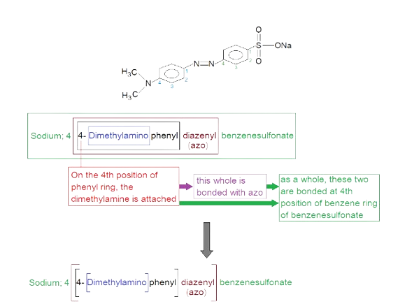 How, the IUPAC nomenclature of methyl orange comes up? The following diagram can make a conceptual understanding without describing the IUPAC rules.