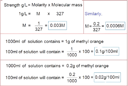 Although, methyl orange is just 0.5g/100ml soluble at 20°C, but, it’s very low molarity is quite enough for its use as indicator. The solution is made in laboratory in distill water with the molarity 0.003 or even 0.0006 molar. For 0.003 molar, its 1g/L (0.1g/100ml); and for 0.0006 molar, 0.2g/L (0.02g/100ml) are used. After dissolving, the solution is filtered and stored in lab. reagent glass bottle. The 0.0006M strength is useful even for a very dilute solutions of acids or bases. It makes a red solution in water.