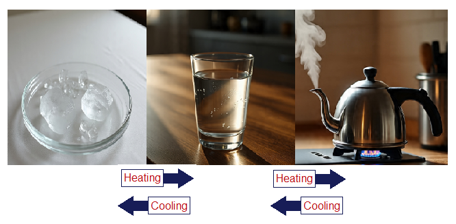 For example, water appears in three states (phases), solid in the form of ice, liquid, and gas in the form of steam, and water vapours. The composition remains H2O in all, but the appearances, shapes and sizes are different. The phase change needs change in heat energy. The ice needs heat to melt and liquid again needs heat to convert into gaseous state; the opposite needs cooling. It is a reversible change and can easily be reversed.