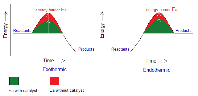 5. Effect of catalysts or enzymes: By definition, “catalysts are the substances that speed up the chemical reactions”. These are used in laboratories as well as in industries. The enzymes are “the biological catalysts”. For example, ‘salivary amylase’ is an enzyme in our saliva that breaks down complex carbohydrates into simple sugar molecules. The catalysts reduce the energy of activation (Ea), i.e., lowering the energy barrier; so, rate of the reaction goes up. Following two graphs are given to explain the role of a catalyst/enzyme in increasing the rate of a chemical reaction (occurs more quickly).