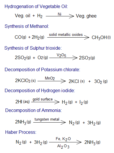 Following few examples are given for various chemical reactions and their catalysts: