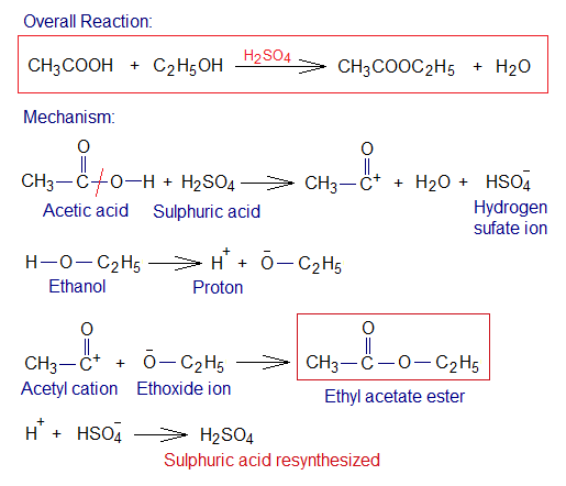 Another important aspect of the catalysts is that they remain unchanged at the end of the reaction; in other words, consumed but regenerated (resynthesized, reappeared). In the following example, a simple mechanism has been given to show resynthesis of sulphuric acid catalyst. Although, the detailed mechanism is somewhat complicated; but a general concept has been elaborated. This is a chemical reaction between acetic acid and ethanol to synthesize ethyl-acetate ester and water in the presence of H2SO4 catalyst. This reaction is called esterification.