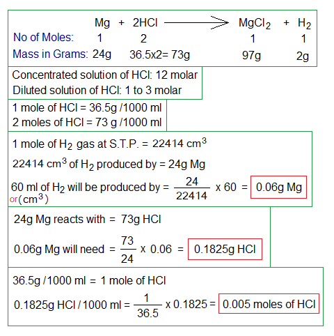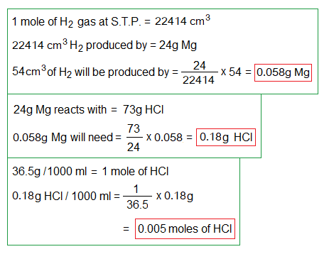 • 1 mole of any gas occupies 22414 cm3 volume at standard temperature & pressure (S.T.P.). So, 60 cm3 of H2 gas will be produced by 0.06g of Mg, as calculated above.