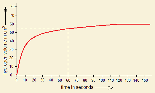2. By the following graph, if 54 cm3 gas is produced in 60 seconds, (1) calculate the amount of Mg consumed in grams. (2) If HCl is 1 molar, then, for 54 cm3 H2 production, the required amount of Mg will react with how many grams and moles of HCl to that time?