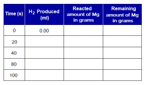 If 12g of Mg are taken to react with 1 molar HCl solution to produce magnesium chloride and hydrogen gas. For the rate of chemical reaction, the formation of hydrogen gas measured in cm3 with respect to time in seconds; and the following graph was made. (1) Use the graph to fill-in the boxes of the table by the amount of hydrogen gas produced at various times. (2) Also calculate the amount of Mg in grams used at a particular time and further, how much would be the remaining amount of magnesium at that time.