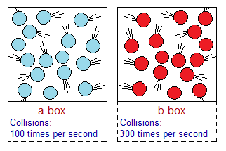 Frequency of Hitting Per Unit Time: More collisions are taking place in a unit time; more will it be successful. Judge from the diagram for ‘a’ versus ‘b-box’ where is the collision frequent? Each particle collides billions of times per second. In a real sense, they don’t hit one another like solid balls of billiard game. But, due to electrostatic forces of attraction and repulsion, they repel each other from a certain distance. This distance depends upon temperature and applied pressure. This pull and push force is called collision to provide us an understanding in a certain sense. So, it might be not a wrong to say that, it is a hypothetical collision.