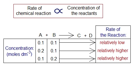 1. Changing in Concentration of the Solution: By increasing the concentration of the reactants, the rate will also be increased and vice versa. There is a direct relationship of rate of chemical reaction with the concentration of the reactants. Suppose, in a reaction between A & B forming C & D, the initial concentrations of both A and B were 0.1 molar. But, when the concentration of A was increased to 0.2 moles, the rate was increased. Similarly, by increasing the concentration of B, the speed of the reaction was also increased.