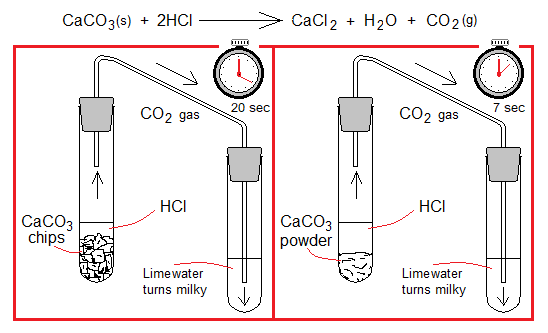 3. Changing the Surface Area of Solids: The fine powder of a substance has larger surface area as compared to its large crystals, chips, grains, lumps or chunks. Fine powdered form will react faster. For example, take two test tubes and add to one powdered CaCO3 and to the other its larger chips. Now, add in both dilute HCl. The chemical reaction in both will be same, but will be faster having powdered CaCO3. The CO2 turns lime water [Ca(OH)2] milky when passed through it due to the formation of CaCO3; and will be quicker in the system containing powdered calcium carbonate as compared to the other.