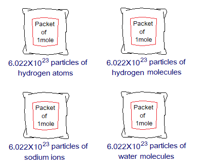 One mole of any substance, either the atoms, ions, molecules, is a packet of particles. Each packet contains 6.022×1023 particles.