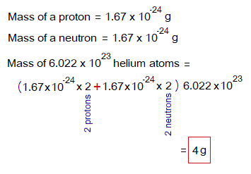 The helium atom carries 2 protons and 2 neutrons; so, its mass will be 4 g for 1 mole (= 6.022×1023 atoms) by the following calculations: