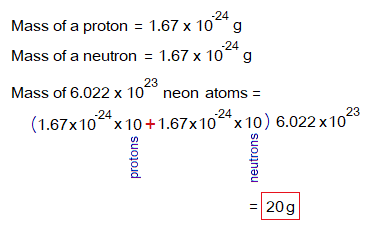 By, this way, the atomic masses, molecular masses calculated by using the number of protons and neutrons exist in that particular substance for their 1 mole (6.022×1023). For example, neon carries 10 protons and 10 neutrons; its mass is 10. Its 20 g for 1 mole will be calculated by the following way.