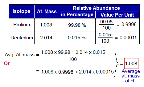 The average atomic mass of hydrogen atom is calculated as under: