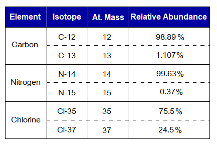Calculate average atomic masses of C, N & Cl from the data given in the following table.