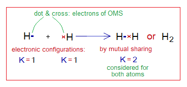- The mutually shared electrons become the property of both the atoms and thus count for both the atoms. For example, hydrogen atom bears one electron in its K-shell. But there must be 2 according to noble gas electronic arrangement, as in helium. Two hydrogen atoms share their electrons together; thus, H2 molecule contains just two electrons in K-shell but mutually shared. So, each hydrogen atom can be said stable by helium electronic configuration.