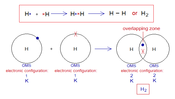 - Overlapping: Two shells of the hydrogen atoms overlap in the middle and resultantly sharing of electrons occur. The shared pair of electrons is mutually shared by both the atoms.
