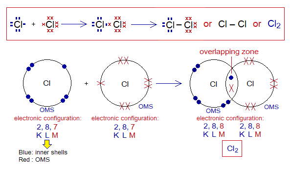 - Overlapping: Two M-shells of two chlorine atoms overlap in the middle and resultantly sharing of electrons occur. The shared pair of electrons is mutually shared by both the atoms.