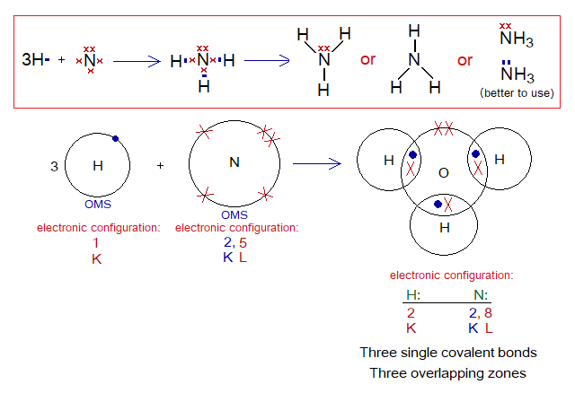 - Overlapping: The K-shell of one hydrogen and L-shell of nitrogen atom overlap together and resultantly sharing of electrons occur. Likewise, two more similar overlappings occur to form ammonia molecule. 1 nitrogen overlaps with 3 hydrogen atoms and makes three single covalent bonds.