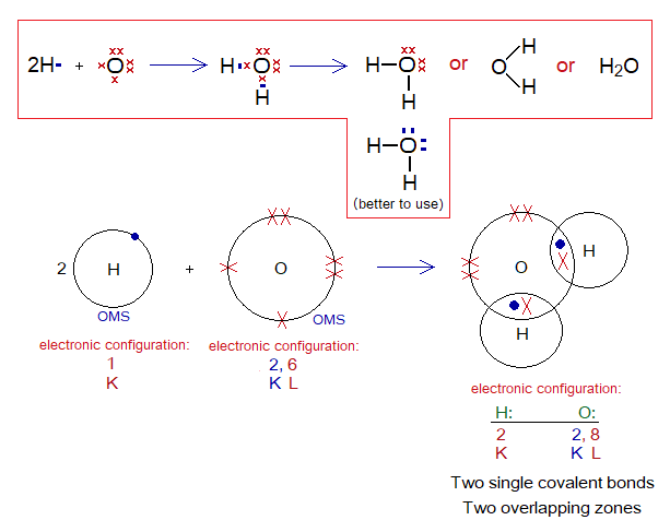 - Overlapping: The K-shell of one hydrogen and L-shell of oxygen atom overlap together and resultantly sharing of electrons occur. Likewise, one more similar overlapping occurs to form water molecule. 1 oxygen overlaps with 2 hydrogen atoms and makes two single covalent bonds.