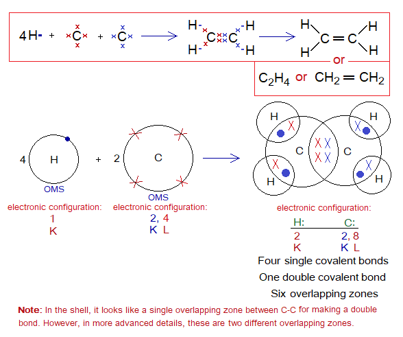 - Overlapping: Two hydrogen atoms share with a carbon atom by K-L overlapping at two overlapping zones. Likewise, two more hydrogen atoms share with another carbon by K-L overlappings. The two carbons mutually share by L-L overlapping at two overlapping zones and make a C-C double bond.