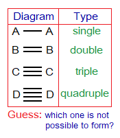 - Covalent bond has three types, single, double and triple. No above to triple exists.