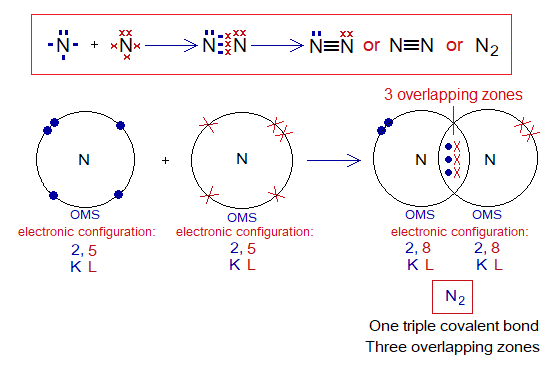 - OMS of N-atom: L-shellhaving 5 electrons, and needs 3 more to pair up and attaining neon electronic configuration of 10 electrons.