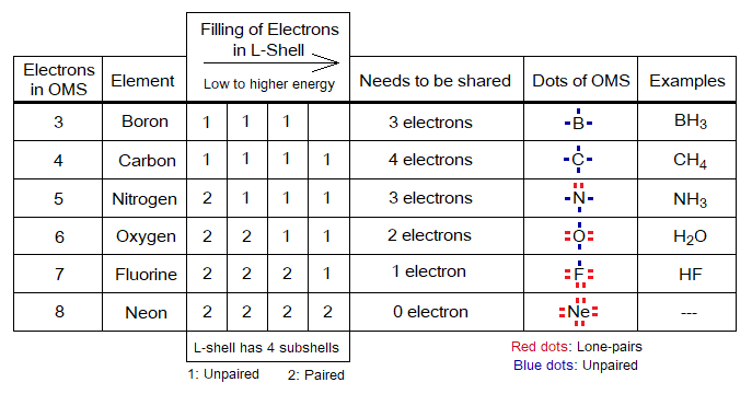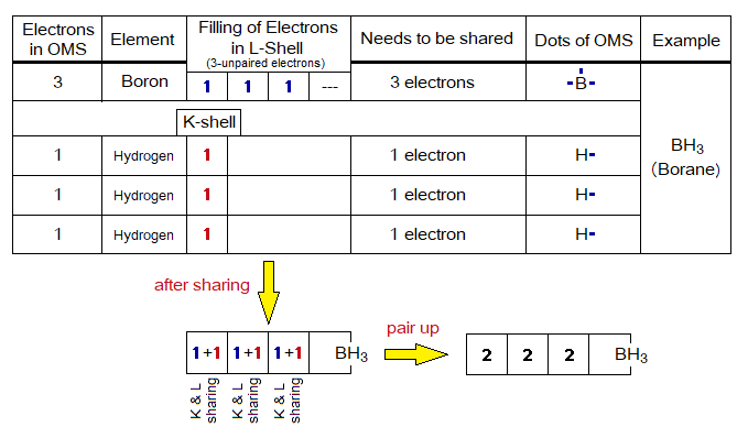 - The electrons exist in the form of pairs in sub-energy levels of the shells. The unpaired electrons of OMS need to be paired up and they do so by covalent sharing between atoms. Go through the following example of borane (BH3, aka boron trihydride).