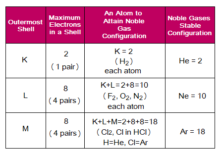 Atoms need to establish stable electronic configuration of noble gases. So, they share electrons. The following table shows first two stable electronic configurations, i.e., of He and Ne, 2 and 10 respectively. If K-shell is the OMS, then it will try to attain 2 electrons. If L-shell is the OMS, it will try to attain 8 electrons, making K+L=10 electrons to get neon configuration.