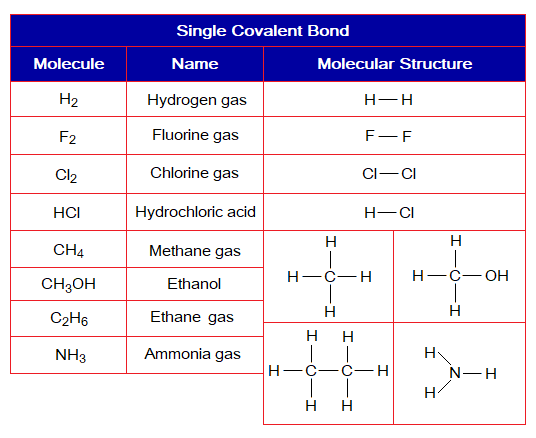 1. Single Covalent Bond: Definition: “The type of covalent bond that is formed by mutual sharing of two electrons between two atoms to make one shared pair of electrons”. It is denoted by a single line between atoms. Following examples form this type of chemical bonding.