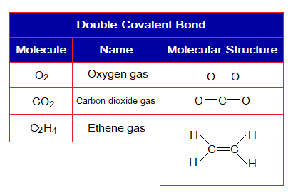 2. Double Covalent Bond: Definition: “The type of covalent bond that is formed by mutual sharing of four electrons in a total between two atoms to make two shared pair of electrons”. It is denoted by a double line between atoms. Following examples form this type of chemical bonding.