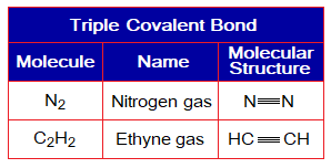 3. Triple Covalent Bond: Definition: “The type of covalent bond that is formed by mutual sharing of six electrons in a total between two atoms to make three shared pair of electrons”. It is denoted by a triple line between atoms. Following examples form this type of chemical bonding.