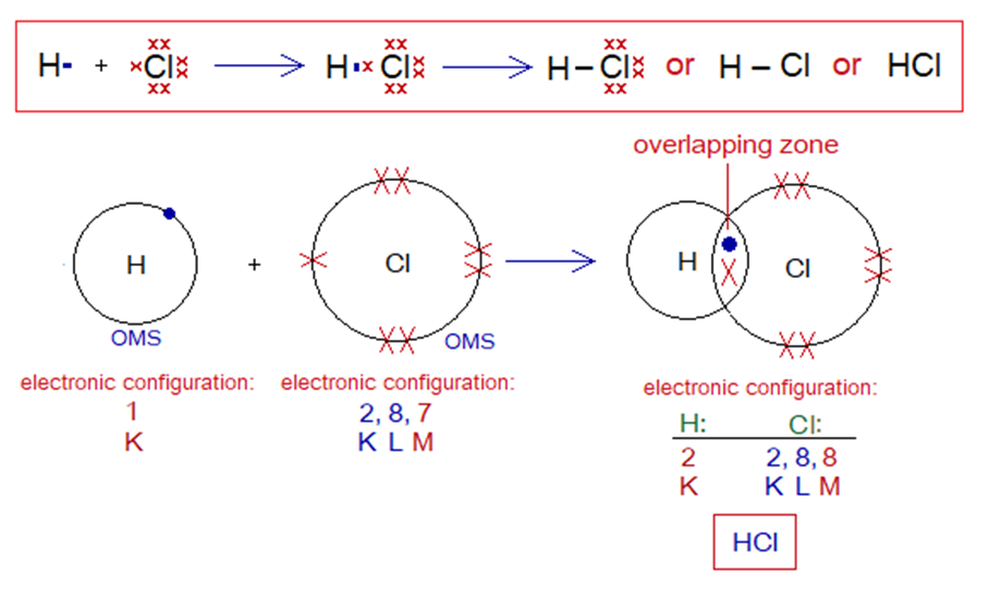 - Overlapping: The K-shell of hydrogen and M-shell of chlorine atom overlap together in the middle and resultantly sharing of electrons occur. The shared pair of electrons is mutually shared by both the atoms.