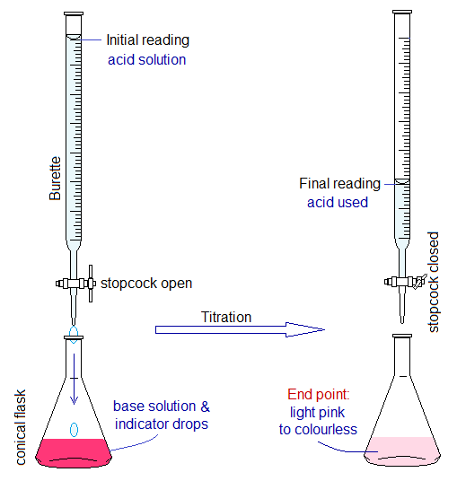 - At a certain point, the pink solution of flask fades to light pink due to adding into it the burette (acid) solution. This is called end point; and at this point the final reading of the acid used is noted. At end point, one more drop can turn the light pink solution into colourless due to fully consumption of base (neutralized with acid: equivalent amount of acid and base) and the unreacted acid changes the solution into acidic media. The end point also called equivalence point or observable point.