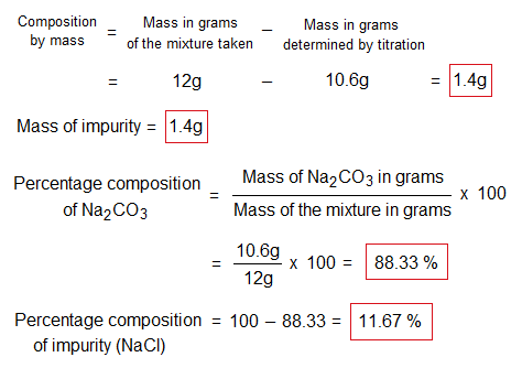 Note: In acid-base titration, the acid will react with Na2CO3; not with NaCl. So, sodium chloride will be considered impurity.