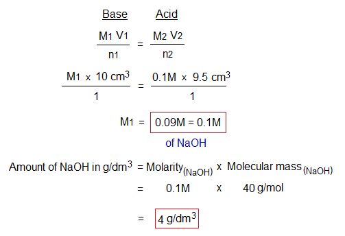 Result: The concentration of NaOH is 0.1M or 4 g/litre in terms of molarity or amount respectively.