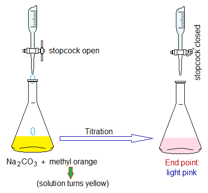 - The base solution is taken in conical flask and 1 or 2 drops of indicator are added. The indicator is an organic compound shows change in colour in acidic and basic media. Phenolphthalein is an example of such an indicator that is used with NaOH base. It gives pink colour in base and colourless in acid. So, the solution in flask turns pink. Methyl orange is another indicator that is used with Na2CO3 and NaHCO3 bases. It gives yellow colour with base; while light pink to red with acid.